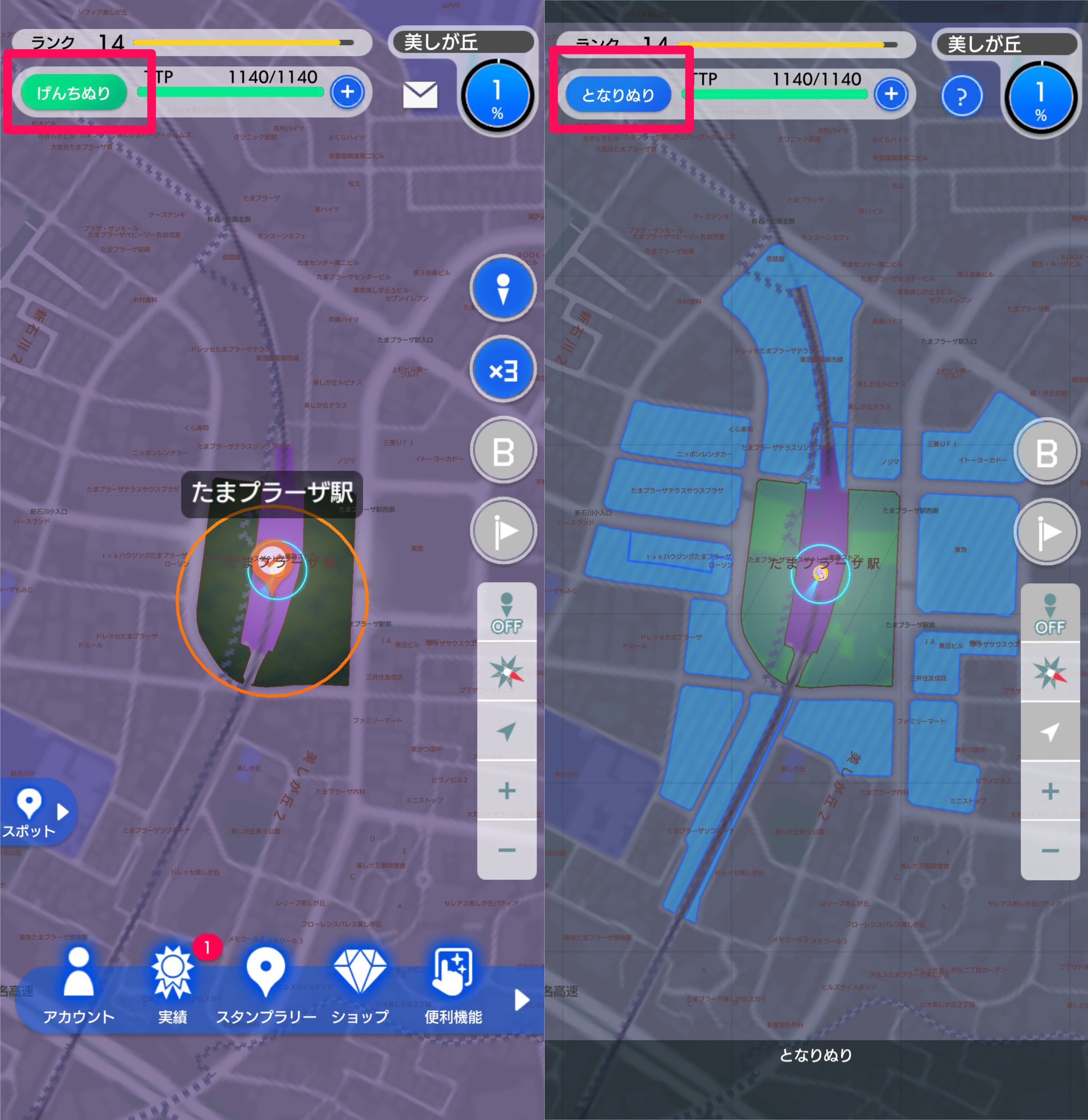 塗り方には「げんちぬり」と「となりぬり」の2種類があります。「げんちぬり」は、実際に現地へ行って記録された街区を塗る方法です。「となりぬり」は、TTP(テクテクポイント)を消費して、すでに塗った街区の“隣”を塗り広げる方法。旅行や出張で現地を少し塗っておくと、自宅からでも「となりぬり」で広げられます。TTPは時間で回復し、まとめて回復したいときは「歩行石」を使います。街区の広さによって必要ポイントが変わるため、効率よくTTPを獲得できる地域を探したり、塗りやすいルートを考えたりと、戦略的な楽しみもあります。