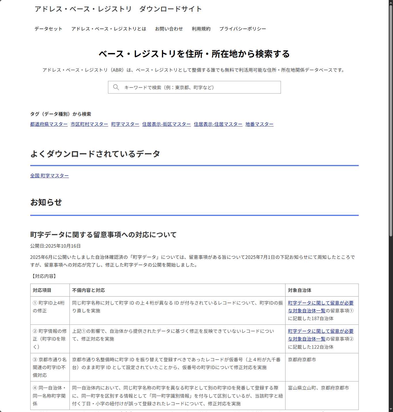 なお、正式版の町字データには、同一の大字・町名に対して異なるIDが付番されているなど、留意が必要な自治体が含まれていたため、2025年10月16日に留意事項に対応して修正された町字データが公開されています。