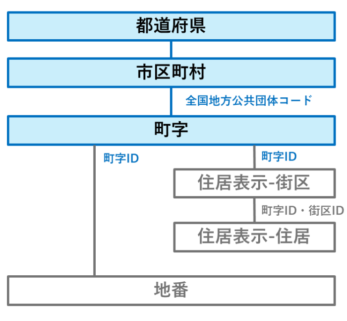 アドレス・ベース・レジストリのデータのテーブルは階層構造で構成されており、現時点では、町字(文字情報)までのデータ整備が完了し、他の項目についても整備方針が検討されています。以下のデータセットについては、現在のところ試験公開版として公開されています。