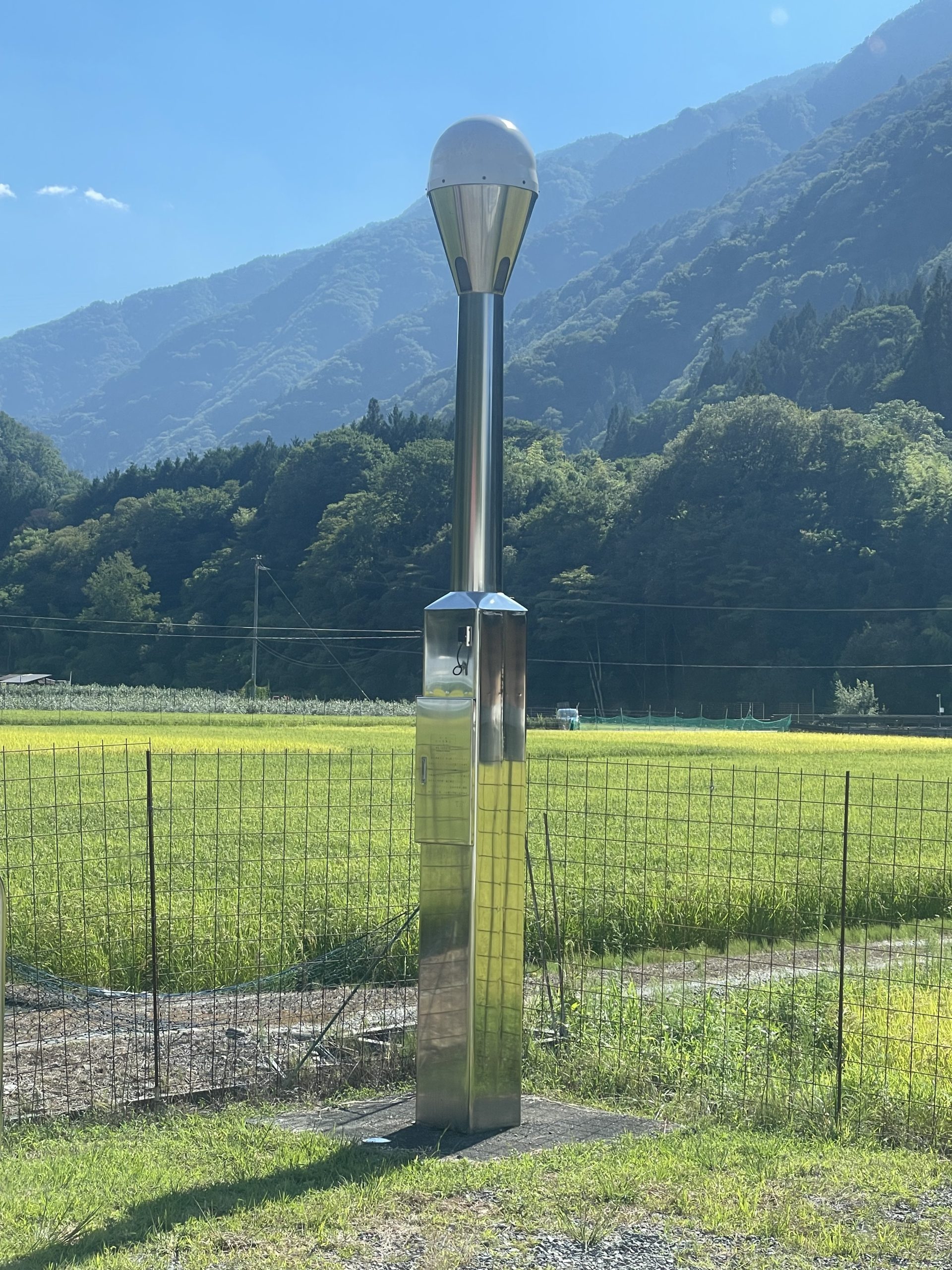 GNSSの測位衛星からの電波を連続的に受信する基準点で、国土地理院が管理する国家基準点のひとつであり、公共施設の敷地内など全国的に約20km間隔で約1,300点設置されています。電子基準点の多くは高さ約5mの金属製の柱で、上部にGNSSの電波を受信する丸いアンテナが搭載されており、内部には受信機や通信機器が格納されています。基礎部には「電子基準点付属標」と呼ばれる金属標が設置されており、距離や角度を測定するための測量機器(トータルステーション)を使用するための基準点としても利用できます。なお、設置場所の環境により柱状ではない特殊な形状を持つ電子基準点もあります。